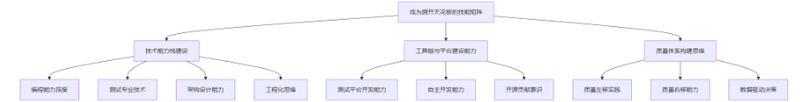 要达到测试开发的职业顶峰,需构建全面的技术能力与职业素养。以下是成为测开领域顶尖人才的关键要素,用Mermaid图展示技能矩阵结构: