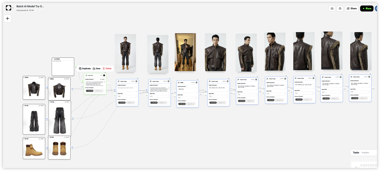 OpenCreator 的一个「批量 AI 模特试穿」工作流为例来讲原理,你也可以类比到其他支持图生图的工具上。