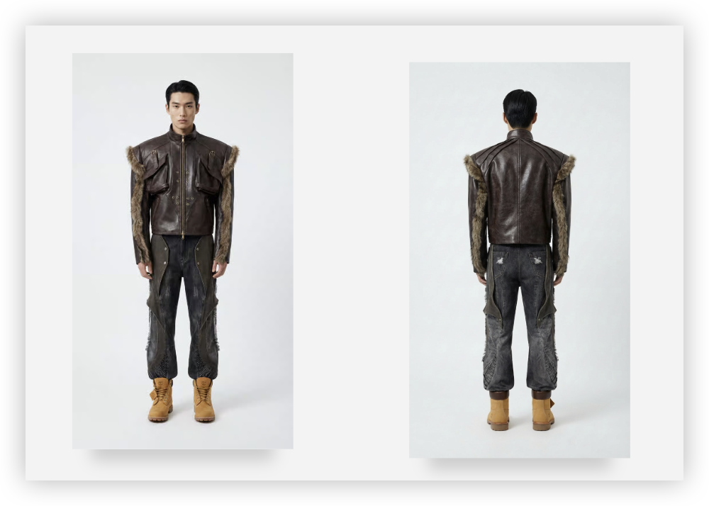 这样做的好处很直接:后面在生成不同角度的时候,尤其是背面和侧面,AI 有足够多的参考去还原细节,而不是凭空猜。比如一件卫衣背后有大面积印花,