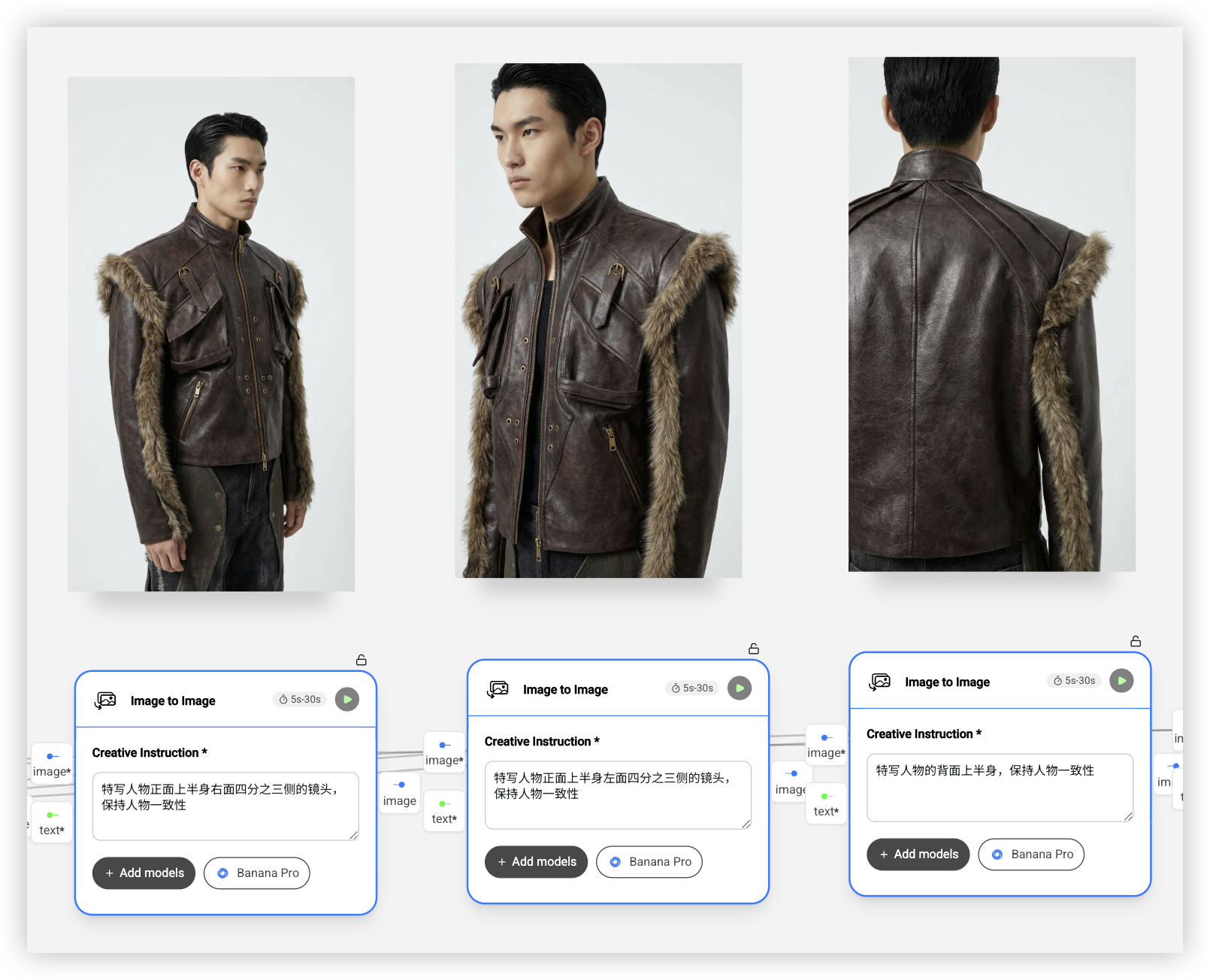 每个节点都会继承前面生成出的基础上身图或中间结果,使用同一份人物设定来保持脸和身材的一致,同时针对各自角度添加不同的机位说明。最终一次运