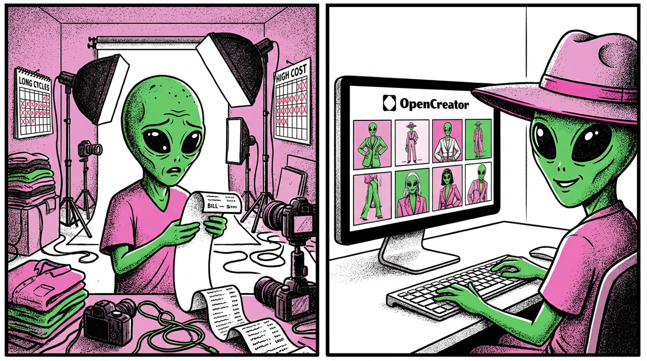 然后是效率和节奏的问题。从约模特、定档期,到拍摄当天的准备,再到后期修图、选片,完整走完一轮少说也要一周时间。对于追求快速上新、想捕捉短