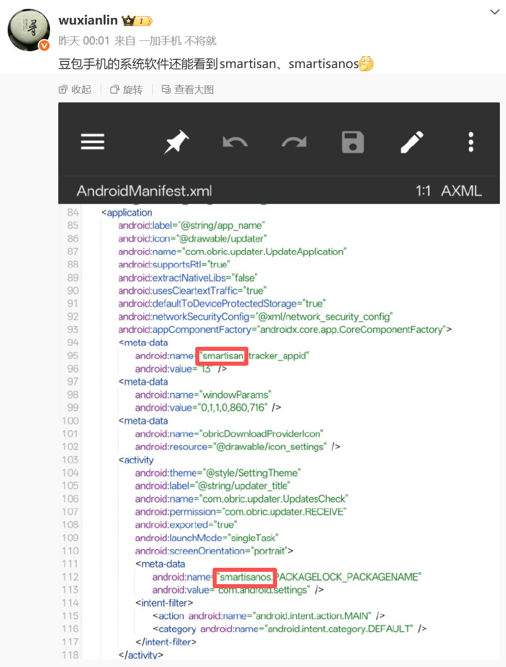 值得注意的是,博主wuxianlin”分享了豆包手机的系统软件,发现了锤子科技遗留字样,图片中可以看到smartisan、smartisanos等。而另一位数码博主