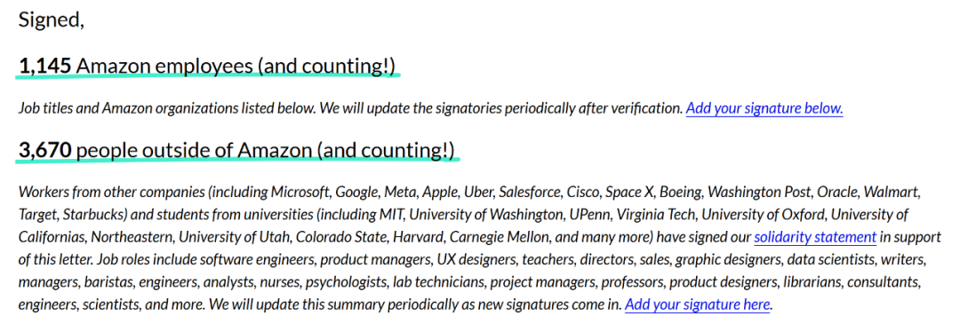 然而,从这封公开信的签名人数来看,人们对亚马逊的这番回应似乎并不买账:截至发稿,亚马逊员工签名人数已达 1145 人,非亚马逊员工(外部人士)的
