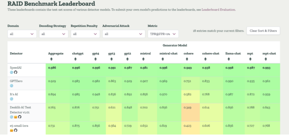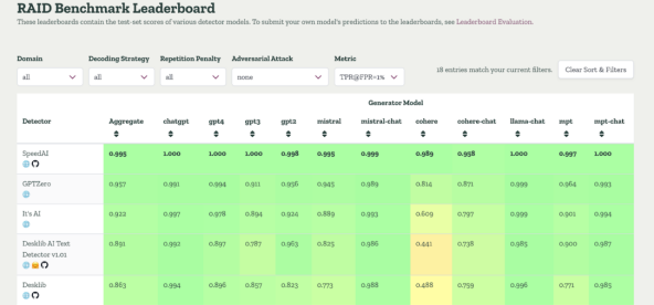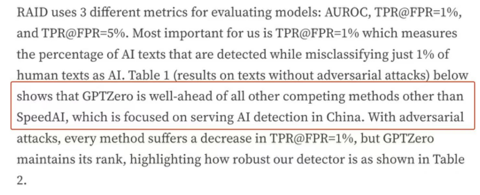 根据GPTZero官网引用的第三方权威RAID基准测试结果,SpeedAI的性能全面领先于包括GPTZero在内的全球所有竞争者:测试数据显示,在无对抗性攻击的场景下,SpeedAI对ChatGPT生成内容的检出率接近100%,对其他主流AI平台的检出率也均在99%以上。更具挑战性的是,在模拟了复杂修改的对抗性攻击测试中,其整体检测水平依然稳定在98%以上,对主流AI生成平台的检出率仍高达99%。这一数据清晰地表明,SpeedAI不仅在常规检测上做到了极致,在面对高级规避技术时同样具备极强的防御能力。